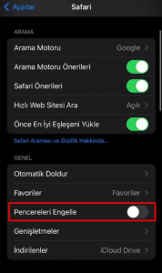 4- Ayrıca kullanmış olduğunuz cihaz bir IOS (iPhone) cihaz ise, IOS cihazlarda açılır pencere engellemeye dair bir özellik bulunmaktadır. Bu durum ders, doküman gibi aktivitelere erişimi engellemektedir. Bu özelliğin kapalı konuma getirilmesi gerekmektedir. Lütfen telefonunuzdan Settings (Ayarlar) > Safari > Açılır Pencere Engelleme (Pop-up Blocker) seçeneğini devre dışı bırakınız.